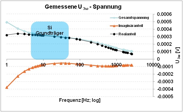 Dargestellt sind die Messergebnisse der Charakterisierung einer Polymerbeschichtung auf einem Silicium-Substrat – aufgeteilt in Real-, Imaginärteil sowie der Gesamtspannung. Die Thermische Welle, hier aufgeführt der 3-Omega-Anteil, dringt dabei in das Material ein. Die Eindringtiefe ist hierbei abhängig von der Frequenz. Bei für kleinere Frequenzen und eine tiefere Eindringung kann so das Trägermaterial eines Zweischichtsystems untersucht werden.