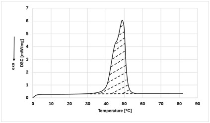 Gezeigt wird der Aufschmelzvorgang eines Phase-Change-Waches. Zwischen 35 und 65 °C ist ein Peak im Signal, hervorgerufen durch latente Wärme, zu sehen. Durch den endothermen Aufschmelzprozess wird Wärme benötigt. Die Menge kann als Kurvenintergral bestimmt werden.