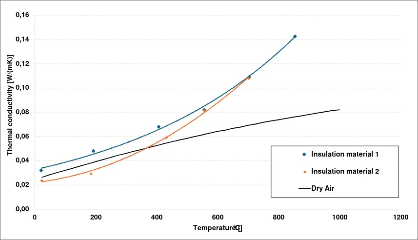 Dargestellt sind zwei Isolationenmaterialienim Vergleich zu trockener Luft.Aufgetragen ist die Wärmeleitfähigkeit des Materials in Abhängigkeit derProbentemperatur. Obwohl trockene Luft, mit einer Wärmeleitfähigkeit von 0,026 W/(mK), beiRaumtemperatur ein geringes thermisches Leitvermögen aufweist, gibt esStoffe wie bspw. Aerogele, die noch bessere isolierende Eigenschaften besitzen.