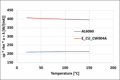 Im Diagramm sind die Wärmeleitfähigkeit einer nahezu reinen Aluminium- (Al6060) und Kupferlegierung (CW004A) abgebildet. Während die Wärmeleitfähigkeit des Aluminiums im betrachteten Temperaturbereich steigt, sinkt die des Kupfers hin zu kleineren Werten ab.